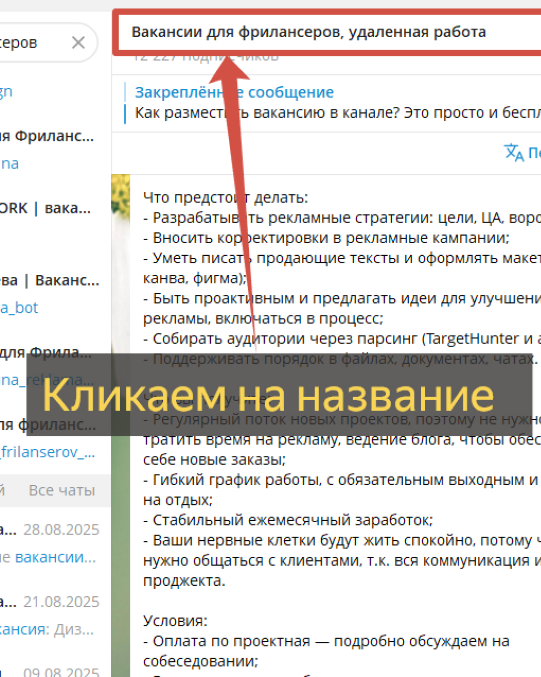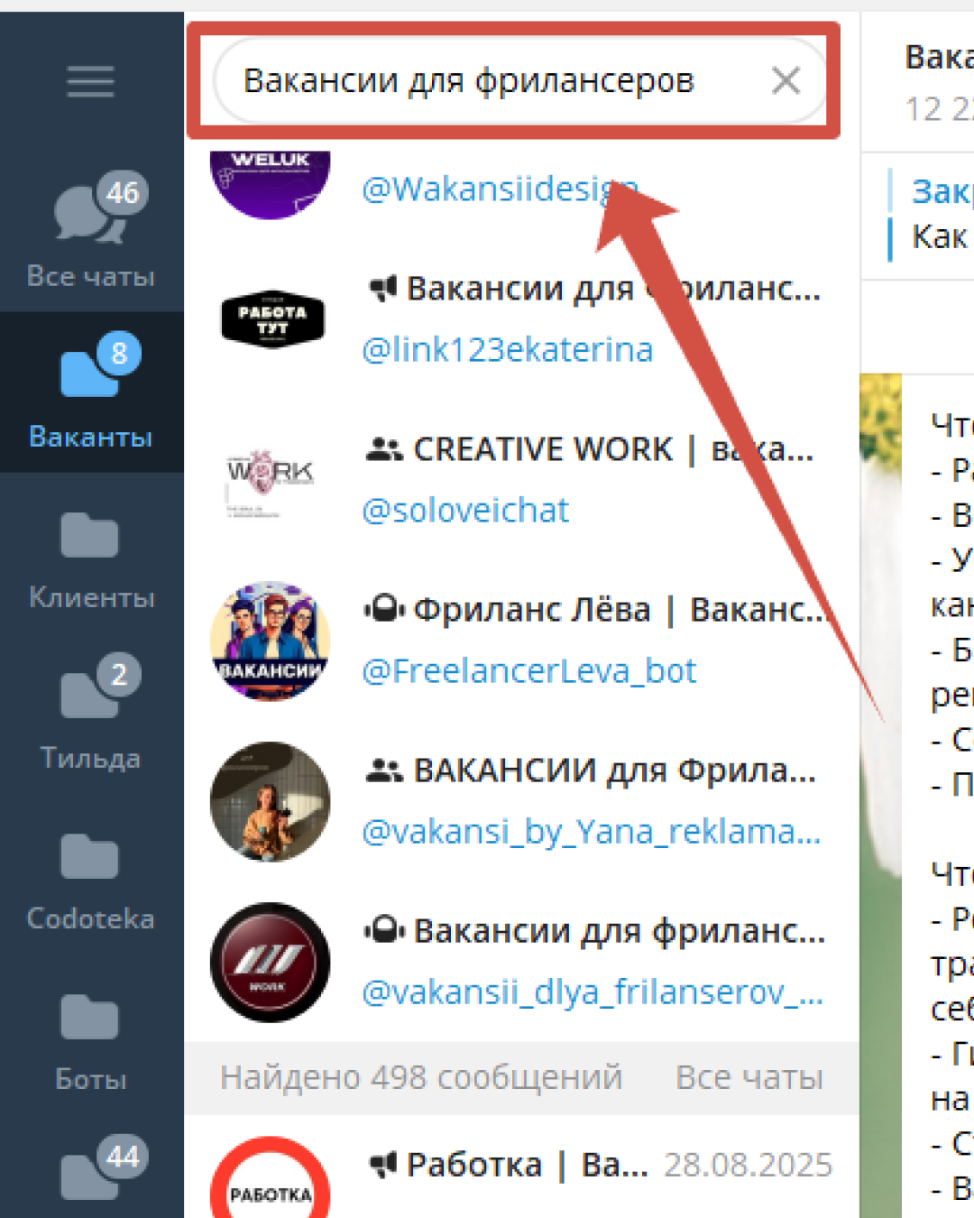 Находим один канал с вакансиями, которые вас привлекают. Например, «Вакансии для фрилансеров»