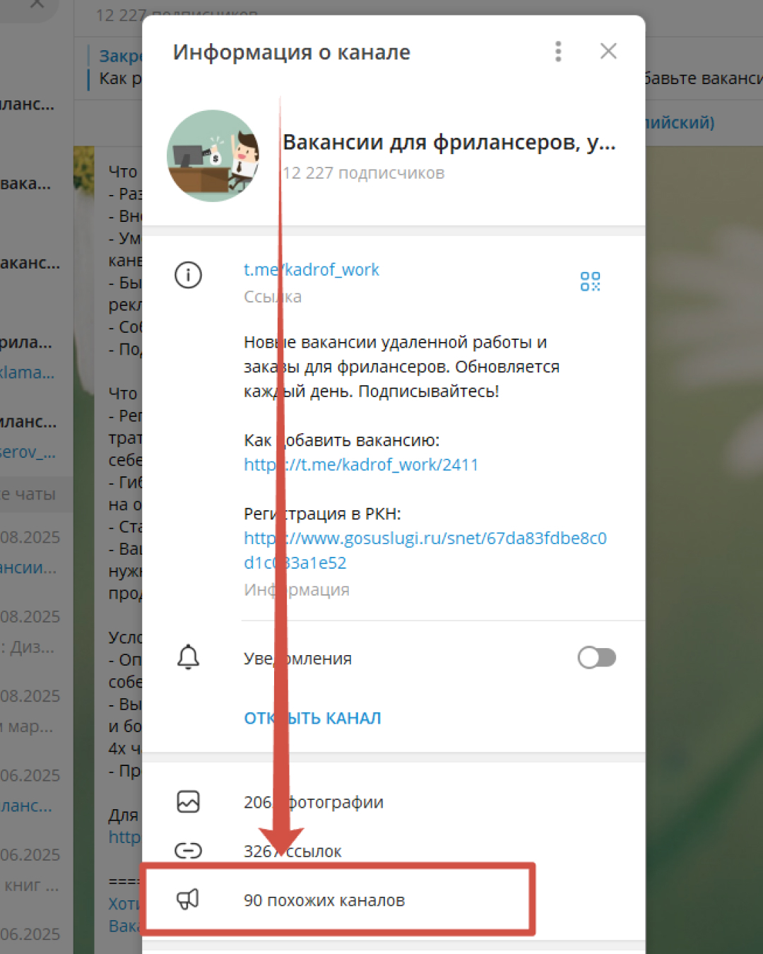 Мотаем вниз, находим логотип в форме рупора с количеством похожих каналов