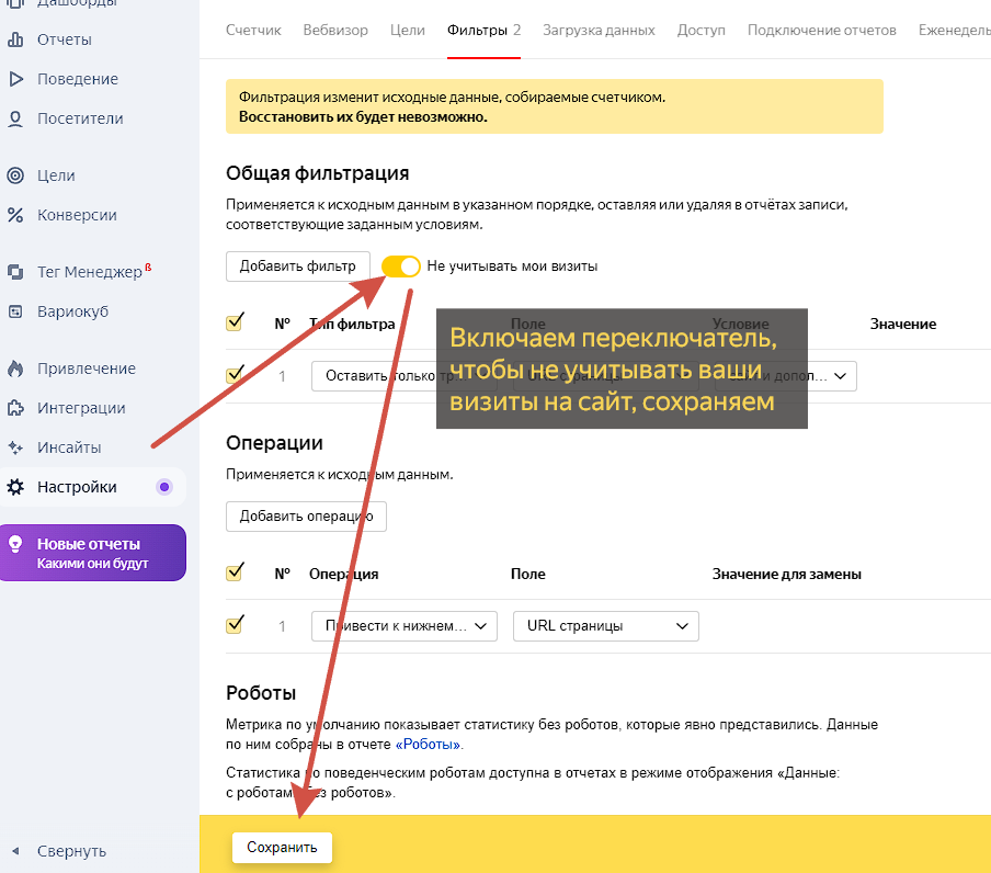 После проверки работоспособности счётчиков Метрики вернёмся в «Настройки» и поставим переключатель «Не учитывать мои визиты» для того, чтобы счётчики не учитывали ваше посещение сайта.
