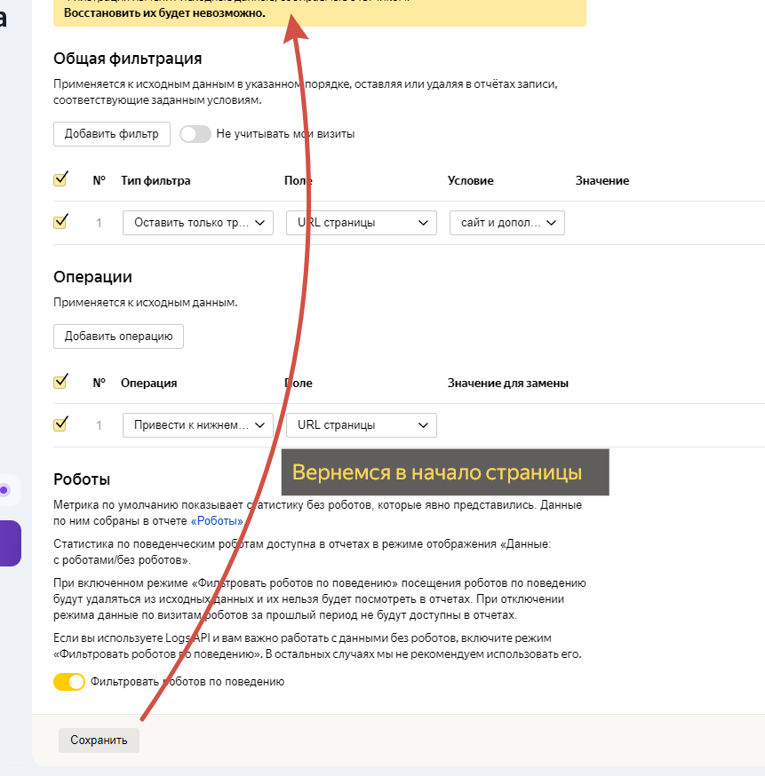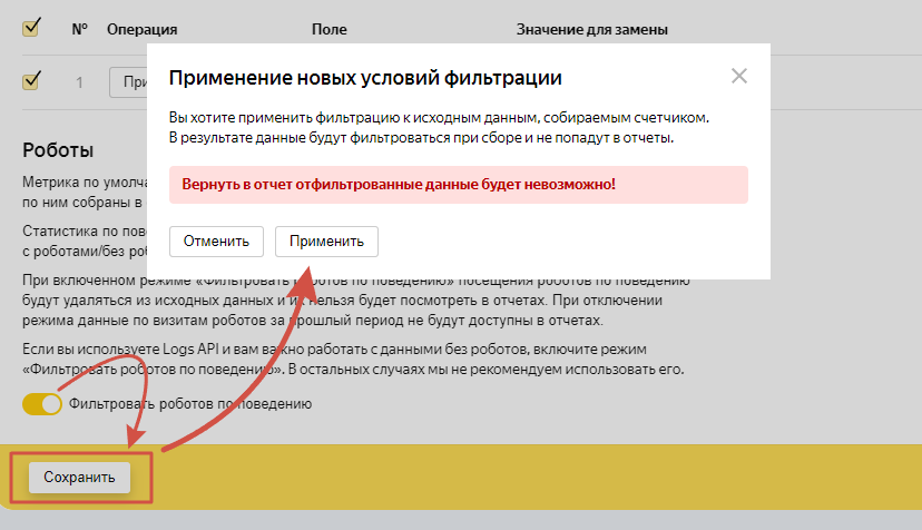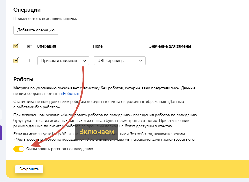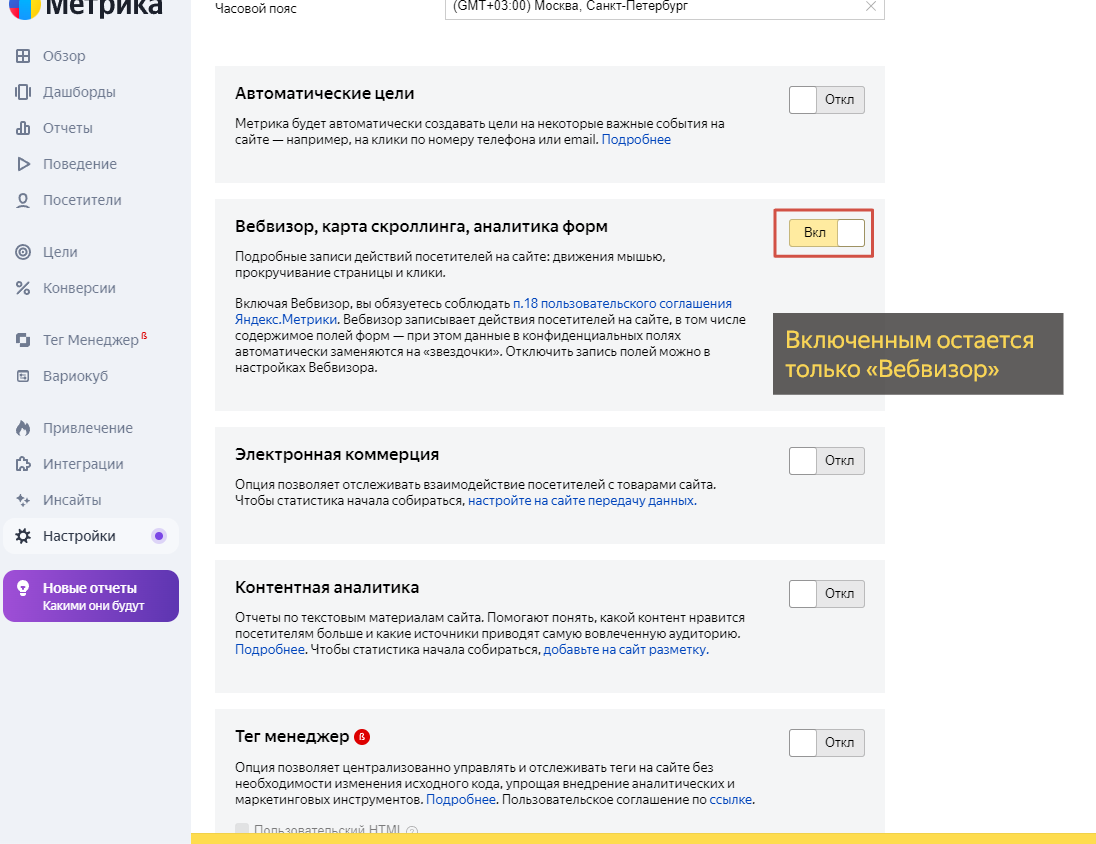 Заходим в настройки счетчика, отключаем «Автоматические цели»